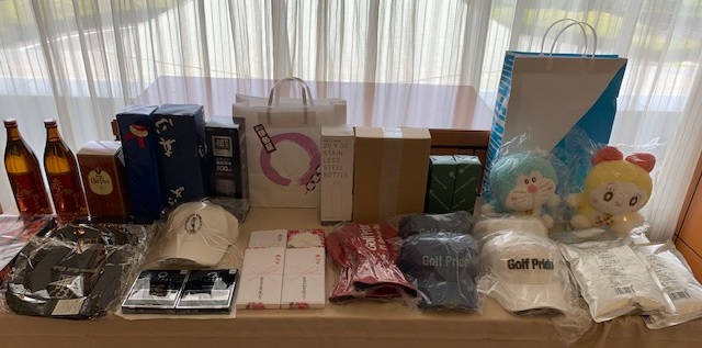 頂きました賞品です。M.Oさんからキャップ、タンブラー、クラブカバー、S.E様よりウイスキー、K.K様よりウイスキー、T.I様よりテレ朝グッズ(ドラえもん等)、H.K様より純米吟醸酒、H.T様よりZAITEN、商品券、東松山カントリー様よりキャディバッグ、加賀屋Gより商品券、パサージュキャップ、No.1グリップ10本セット、BANDEL ネックレス、BANDEL ブレスレット、廣野GCポーチ、ステンレスボトル(水筒)、赤霧島、小樽Cタンブラー、アルバカレー(大)(小)。 ※敬称略・順不同
