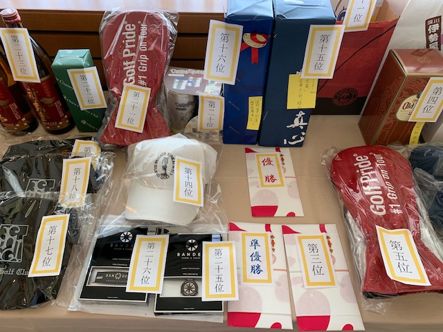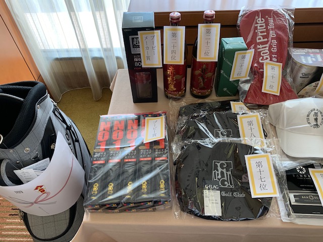 16時20分、表彰式及び懇親会スタート。田村総支配人からもご挨拶を頂戴いたしました。(キャディバックのご提供を頂きありがとうございます。優勝賞品として使わせていただきます。)縁の皆様から頂きました賞品はこちら