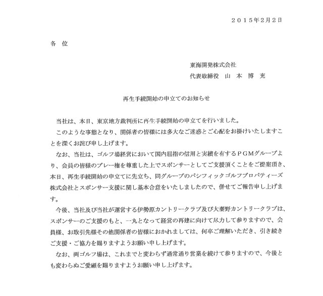 HOMEその他大秦野カントリークラブ 2015年2月2日に経営会社が民事再生手続きを申立