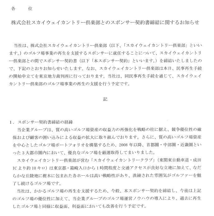 なお、2015年3月31日付で(株)アコーディア・ゴルフが、スカイウェイカントリー倶楽部のゴルフ場事業の再生を支援するスポンサーとして、スポンサー契約書を締結しました。