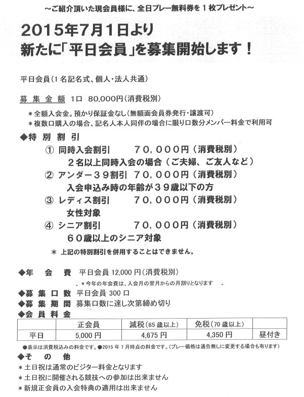 鹿島の杜カントリー倶楽部 平日会員募集について