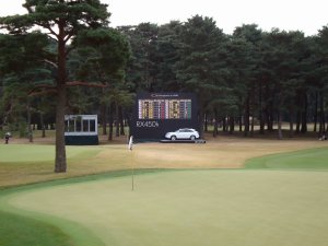 受付で頂いたドロー表をもとに、どの選手に付こうか考えましたが、まずは、18番のギャラリースタンドに陣取り、数組のパーティを眺めておりました。18番グリーン上での皆さんのプレーを見ながら、「あれ、このホール、9番じゃないの?このホールって確かロングで私が大好きな9番のロングホールだったはず、、、、で、18番は確かミドルだったはずだが、、、」どうやら、通常のアウトとインを今トーナメントは逆にしているようである。で、頂いたドロー表の裏のコース図面をじっくりと眺めていると、いつもはロングロールである4番(今トーナメントでは13番)がミドルになっていることに気が付いた。つまり、今トーナメントはいつもの7,024yパー72から13y短くなったパー71で行われている事に私はようやく気が付いた。