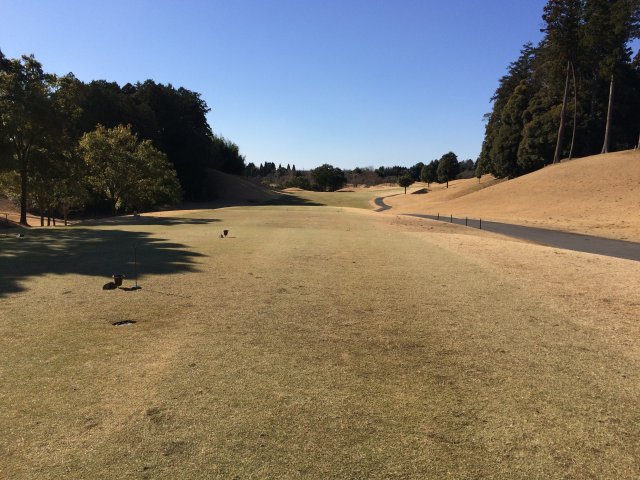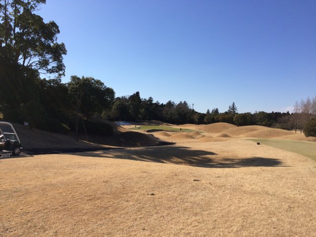 14番 323y UTで打ち狙い通り。残り80y?を56°で狙うも大トップ。奥の急斜面から上手く打つも止まらず5となる。G.Sさん連続パーセーブ。
