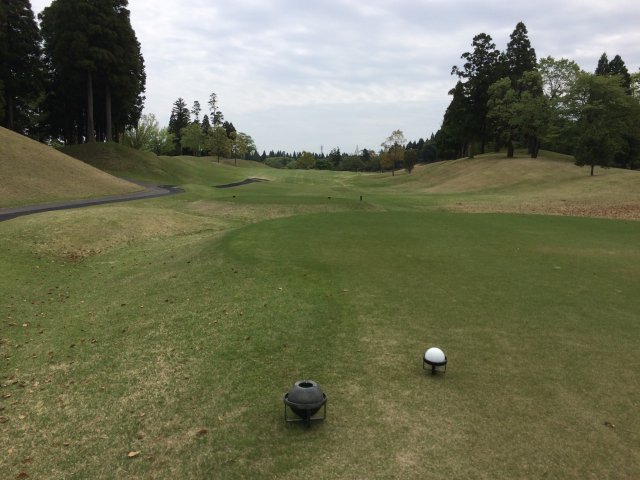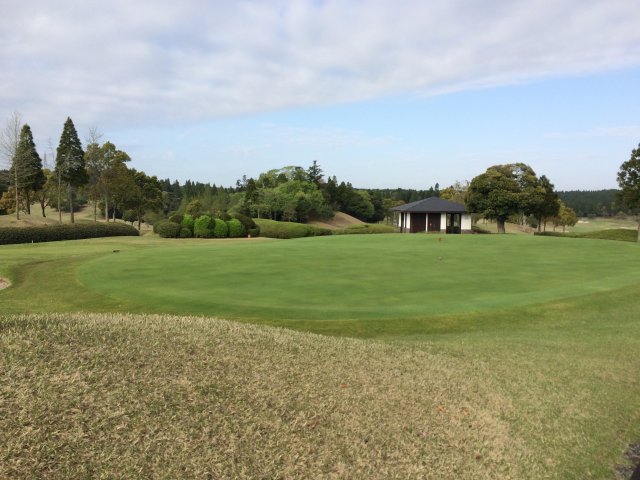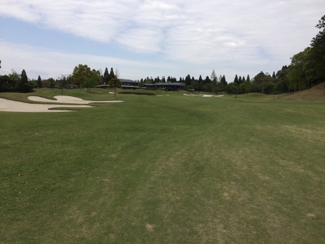 14番 363y PAR4 TEEショットは少し根元に当たってしまい、残り110y。強いフォローと読み、PWで狙いすましたが、風が弱まりショート。アプローチを1mに寄せてパー。