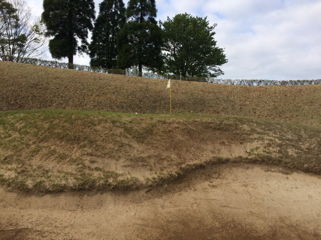 18番 374y PAR4 少し根元に当たったが何とかフェアウェイへ。行ってみるとまたディポットでした。2ホール連続でディポットとは・・・残り150yを7Iで打つが、右にすっ飛びバンカーへ。イージーなバンカーをミスし再度バンカーへ。スタンスはバンカーの外、つま先下がりと難解なライだがこれを50cmに寄せるショットで5とする。