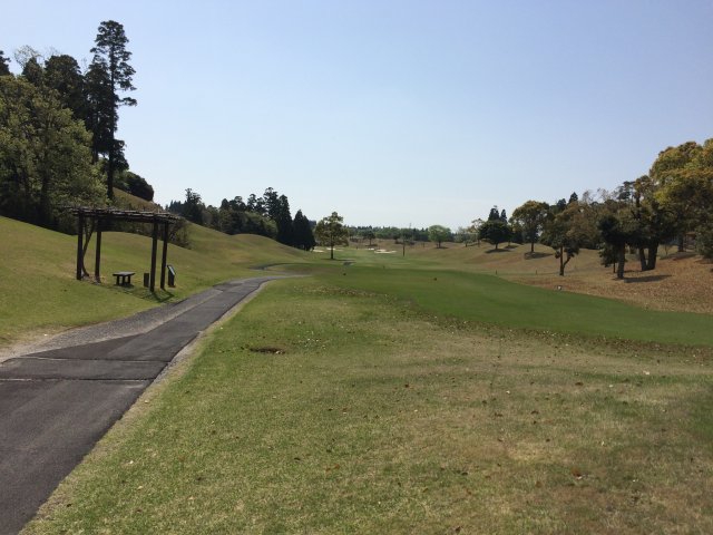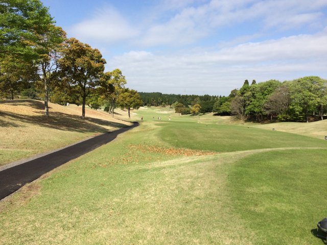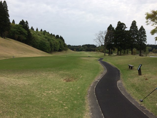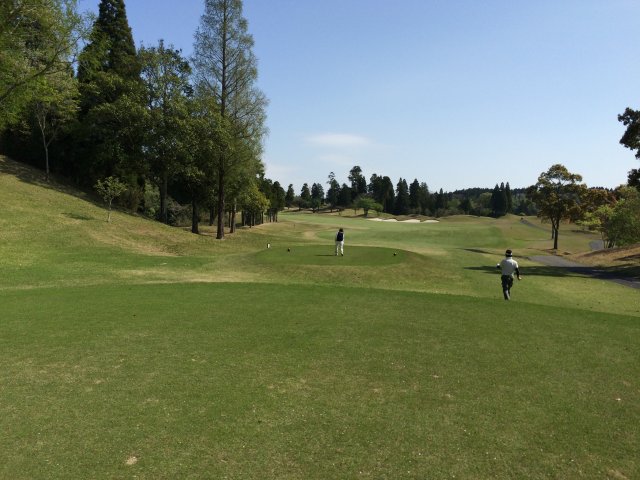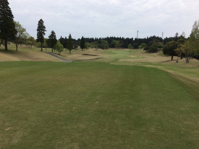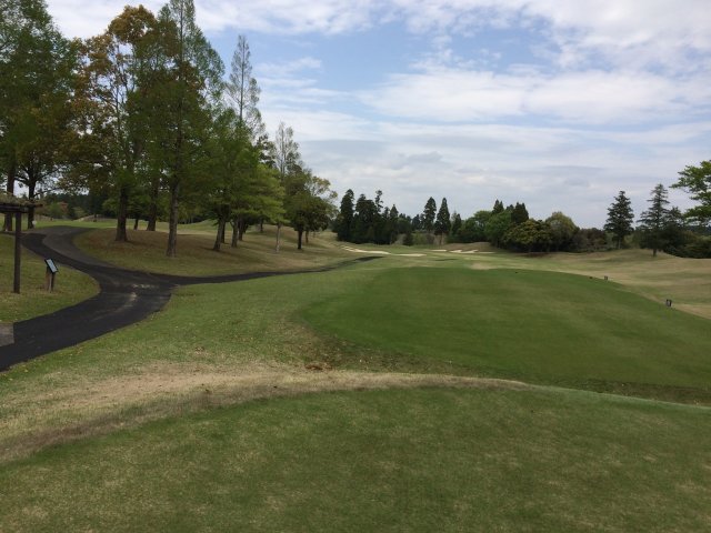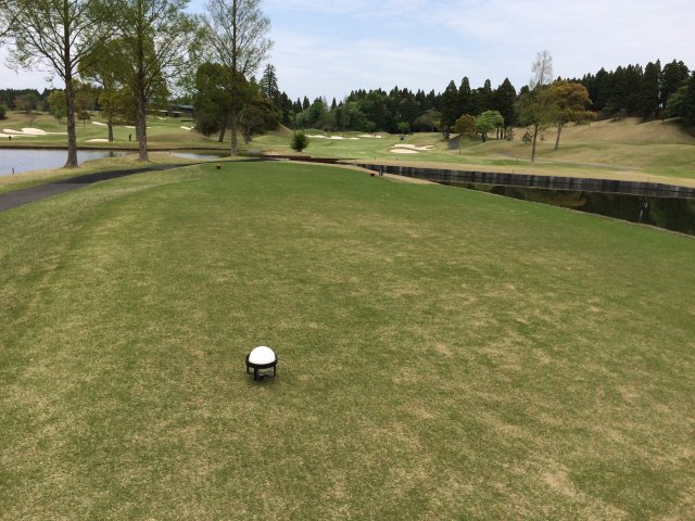 16番 515y PAR5 2オンを狙い叩いたが、思ったより飛ばず。2オンを諦め、UTで打つが左の傾斜地へ飛ぶ。傾斜が強く大トップし奥の林へ、何とか林からは救出したが届かず。次で寄せて6となる。
