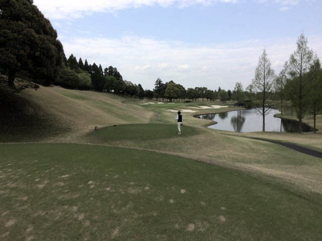 3番 391y PAR4 右ドッグ。左からスライスを打ち、完璧。残り140yを9Iで打つも、引っかかりバンカーへ。これを1mに寄せて、しっかり沈めパーとする。