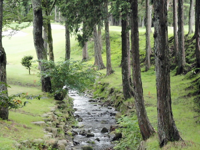 楽しみにしていた当日、憧れのコースで加賀屋さん縁のメンバーの方とご一緒させていただきました。下手っぴなので申し訳なく思いながらも、気さくな方々と和やかにラウンドです。しかも、キャディーとして所属プロがついてくれました。おぉ、豪勢だ。でも、アドバイスどおりにできない自分がなんとも残念です。とはいえ、天候にも恵まれた歩きのラウンドって気持ち良いものですね。