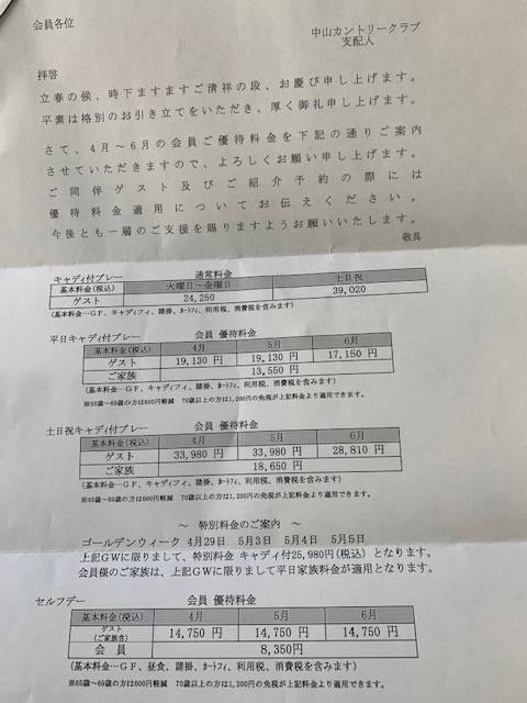 先日、中山カントリーから料金のご案内が届いてましたので、それをお知らせします。中山を例にすると、ご主人が入られて、奥様を伴われた時、4月5月の土日は通常のゲストは33,980円ですが、同伴家族は18,650円となります。