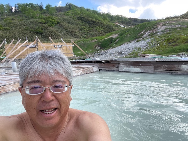 6月13日木曜日朝イチのJAL便で青森空港に飛びました。レンタカーを借りて、まずは、秋田県は仙北市の乳頭温泉に向かいました。隊長は何も仰られませんでしたが、きっと道を間違えられたのでしょう、なんと3時間半(普通は2時間40分くらいのはず・笑)掛かってようやく秋田県の乳頭温泉郷(7つの温泉があります)に到着しました。全部入りたいところですが、時間がないので、一番有名な鶴の湯に到着。ここのお湯はまさに乳白色の硫黄泉でした。時間欠乏のため、ゆっくりできなかったのが残念でしたが、最高のお湯でした。今度はゆっくり残りの6つのお湯を満喫したいです。また是非是非来たい温泉でした。