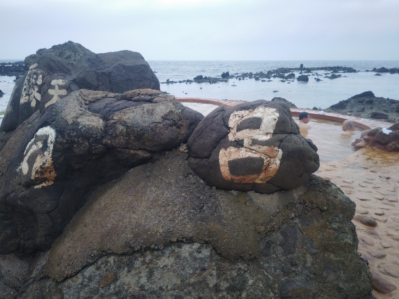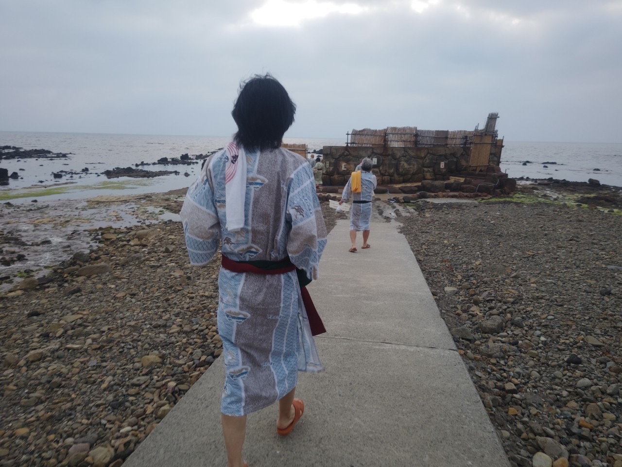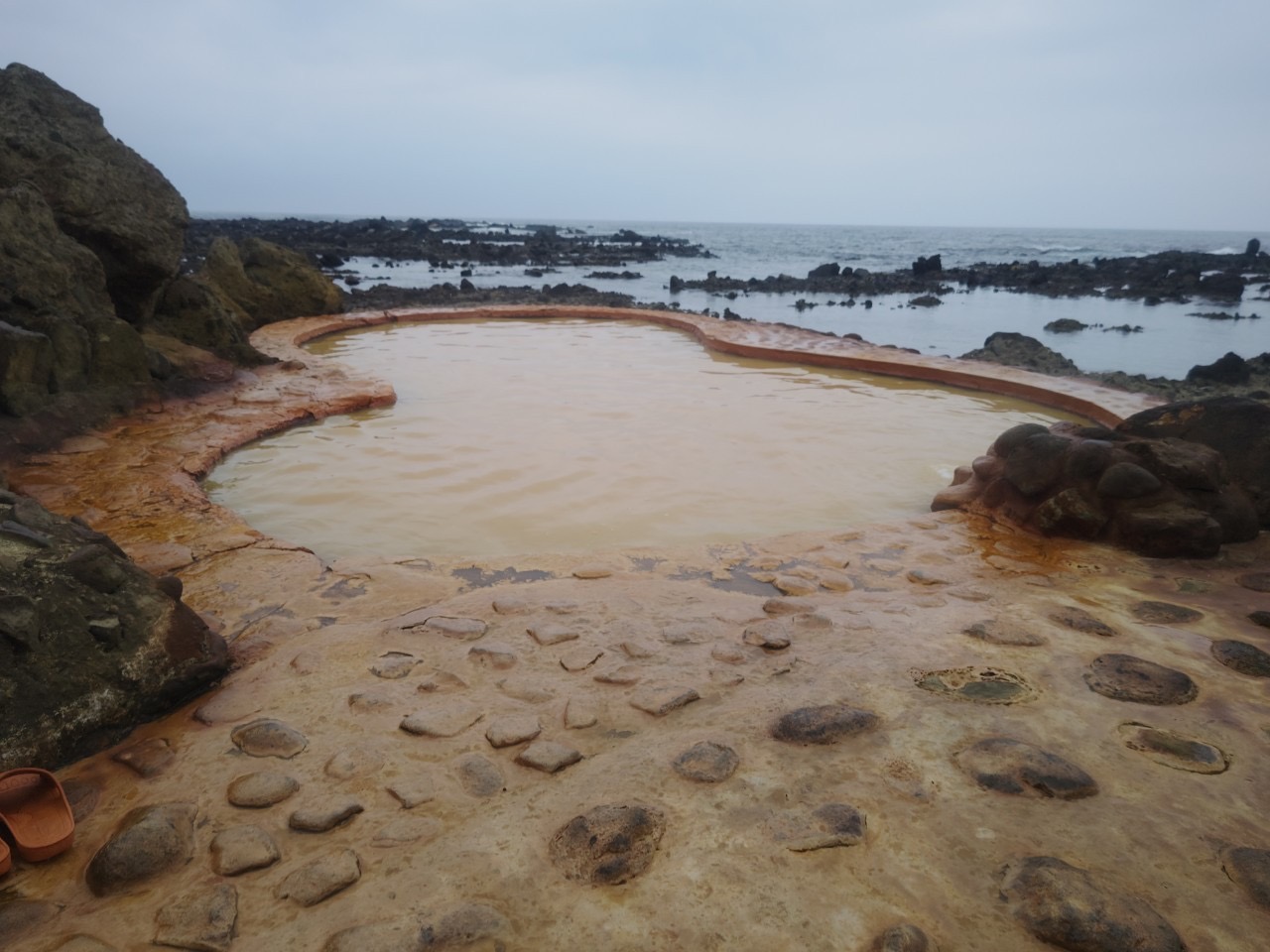 さ、ここから今日の宿である青森県深浦町の黄金崎不老ふ死温泉を目指します。ここは夕日が沈むのを見ながら入る浜辺の露天温泉が最高とのことですが、19時半で入れなくなるそうで、急いで向かいました。グーグルマップでの到着時刻は19時13分でした。ここを隊長のスペシャル運転で全速前進します。で、なんと18時50分に黄金崎不老ふ死温泉に到着。浜辺の(海の中にある)露天風呂に間に合いました!で、ここのお風呂はなんと海の中にあるんです。残念ながら、この日は雲が多く、夕日が落ちるのまでは見れなかったです。お湯はまさに鉄分を大量に含んだ赤褐色の温泉です、鉄のにおいがムンムンしてます。ここでは朝夕食ともにビュッフェ形式でしたが、実に美味しく、会計した時のリーズナブルさにビックリしました。ここは、まさに、社長~!やす~い!でありました。ホント、食事は最高でした。特に蛸と帆立が!