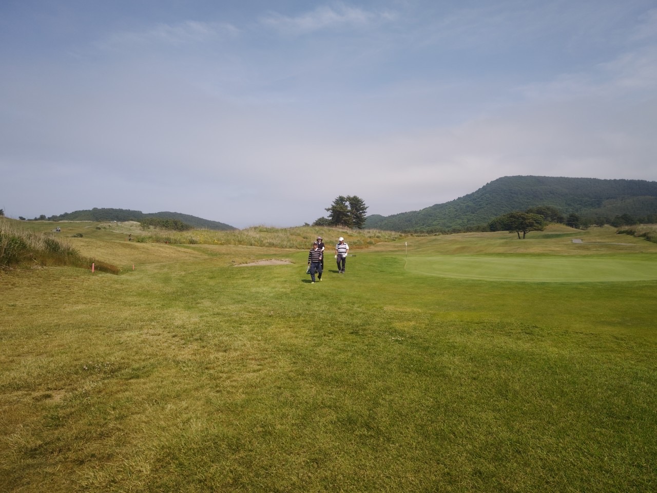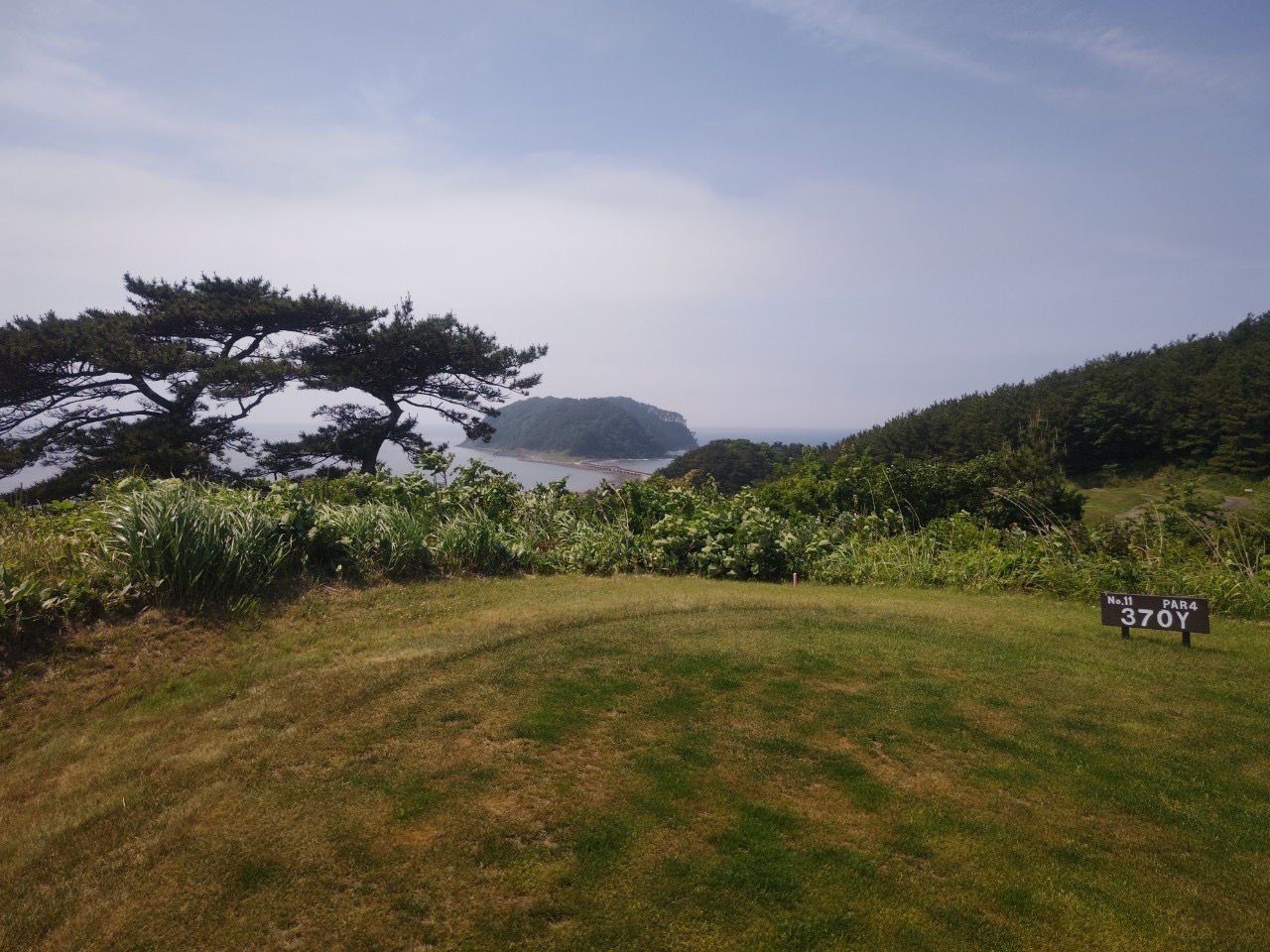 翌朝も酸ヶ湯温泉を十分楽しんで、セカンドコースは夏泊ゴルフリンクスです。まず、道中の透き通った海に感激を致しました。吉幾三さんと舞の海秀平さんが名誉会員になっておられました。リンクスと名前が付いてますが、少し前に本場アイルランドでプレーをしてきた私には確かにブッシュがあったりはしているが、うーん?という印象で、コースから海が見えるのも残念ながら数ホールだけでした。また、整備不良なのでしょうか?コース内は芝が剥げている箇所が多く、で、そこが凸凹していて足を捻挫しそうになりました。夏泊への期待が大きかっただけに残念でした。