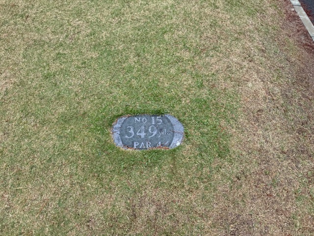 15番349yミドルは、ドライバー、8アイアンで左へ。寄らず入らず。
