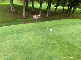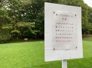 このホールはグリーンに乗ったらパットを免除され1パットで入ったことにします。何打目でもOKです。