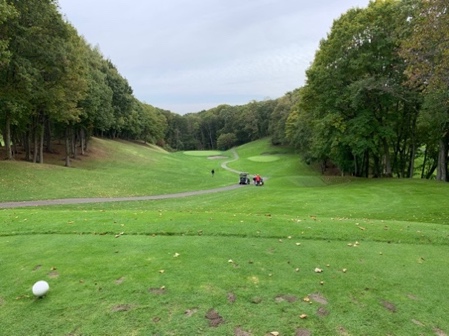 大きく左に曲げると、カート道路でキックして奥のOBゾーンやブッシュに隠れるクリークに注意します。
