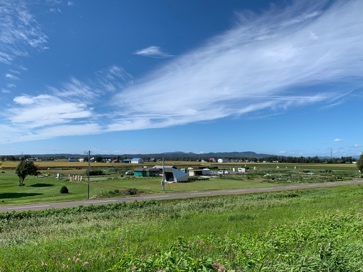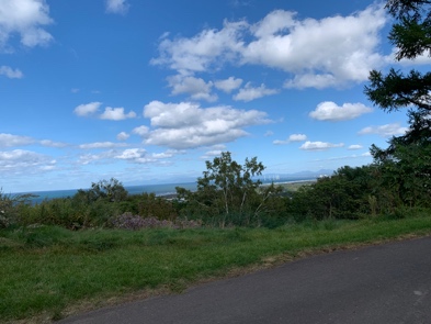 正面の木々や空に高く広がる雲方向は海岸線があり、アゲンストがいつもの風です。