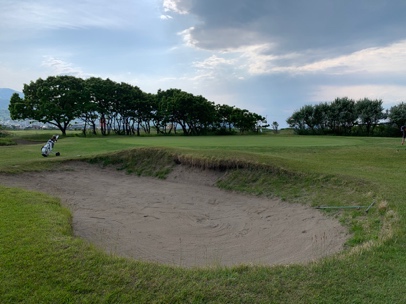 グリーンを狙うショットは右側からは手前バンカー、左に引っ掛けるとそちらにもバンカーが効いていて、バンカーインしたり、大きく曲げると難易度の高いリカバリーショットが残ります。
