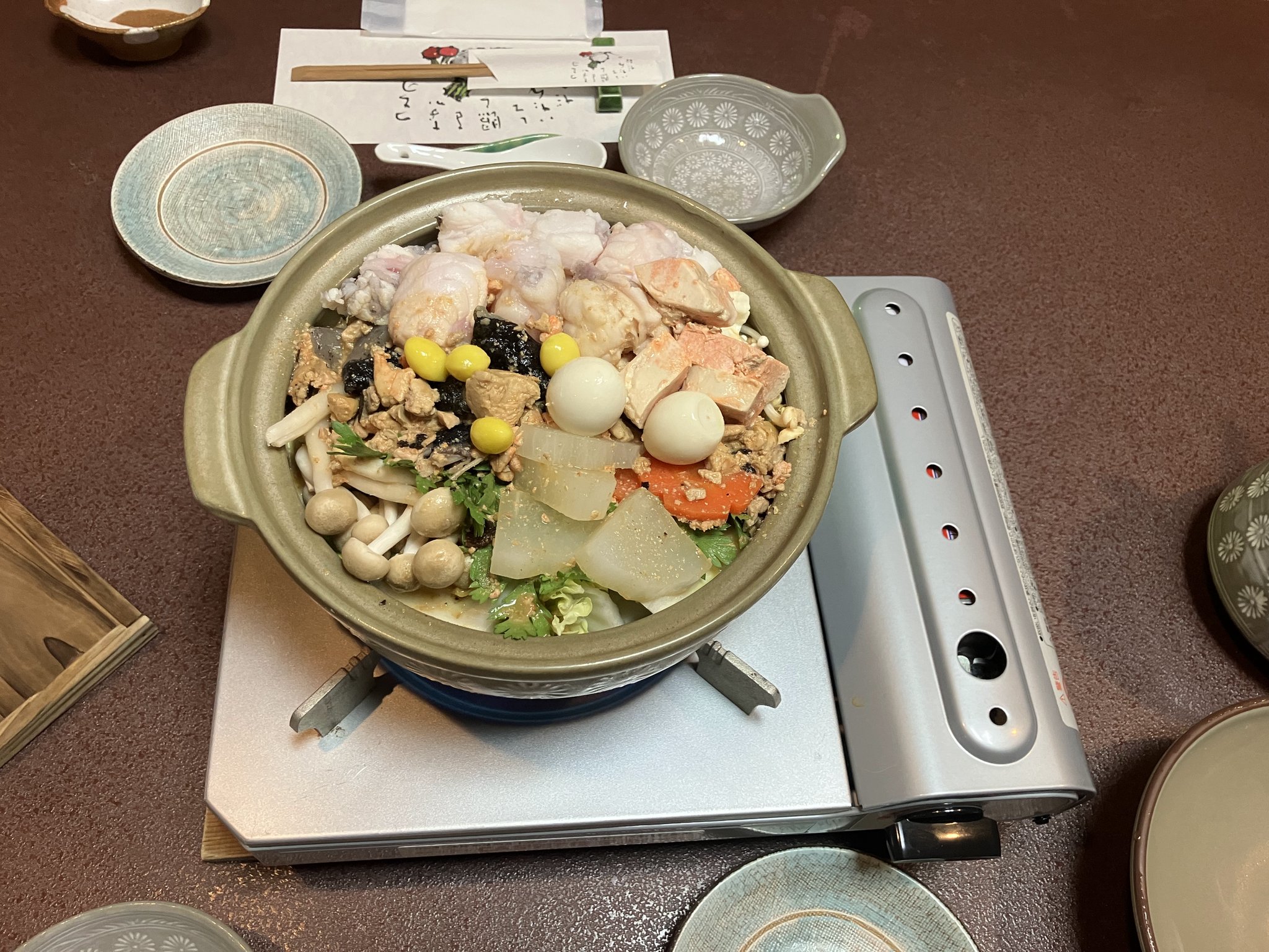 あんこう鍋食べに行こうという企画のお誘いをいただきましたので午後休みをとってJRの駅へ。アナウンスがはっきり聞こえなかったんですが上野東京ラインが止まっているようなので山手線で上野へ。コンコースに上がってみると常磐線が止まっているとのこと。うわぁ。どうしたもんかなと思っていたら心配してラインが入ってました。南浦和で拾っていただいて無事にロッジ到着です。ありがとうございました!!タクシーで夕食会場に向かいます。アレンジしてくれた方が毎年伺っているお気に入りのお店は予約できなかったのですが、さらなる伝手で教えてもらったお店だそうです。店構えも良いじゃないですか。お酒と共に美味しくあんこう鍋をいただくことができました。大洗に来た目的は達成したので明日のスコアは悪くても良いかな(もう言い訳を始めるのか?)。