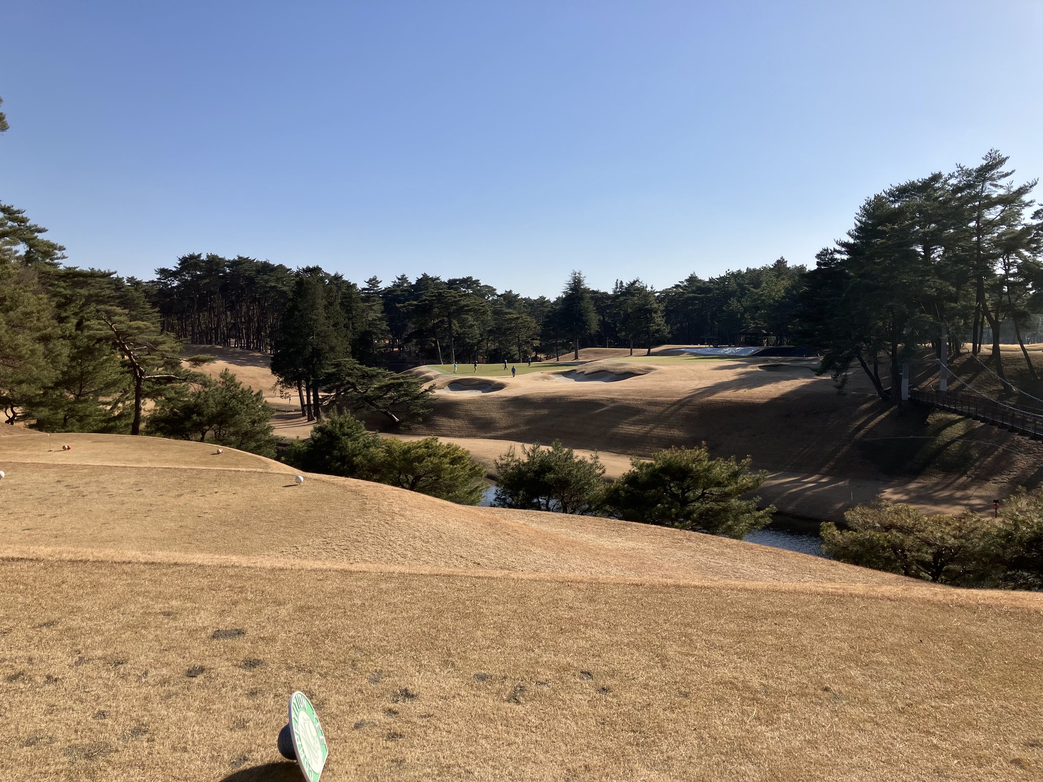 インスタートで最初のロングは花道に持っていければという3打目がシャンクして4打目は出すだけ、アプローチもミスって6オンとガッカリスタートです。続く11Hは毎回なぜか左の池方向なんですよね。「よしっ、引っかけちゃダメ、引っかけちゃダメ」と声に出したにもかかわらず池へ。カーンと跳ねた後に滑って奥に落ちたように見えたのですが、同組の方がラフまで上がったんじゃないの?と言ってくれました。現場に行ってみると奥側は日当たりが良いのか溶けていましたのでやっぱりダメかなと思ったのですが、見てくれた方のおっしゃる通りで横に上がっていました。よかったよかった。助かりました〜と転がして出すつもりが、フェイスが被ったのか再び池際に沿って走ります。ウオー何やってんじゃ、オレ!落ちはしませんでしたが当然変な場所からの3打目です。え、スコア?推してしるべし。その後もダボ続きでやってきた2回目のロング、左の林に入れ、出して、再び左のラフへ。みたび左に引っ掛けて木に落とされてバンカーへ。そして出ない。出ない。出なーい。8オンでございます。前に行ってくれ〜(切実だね)。