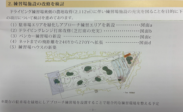 ■一方小樽カントリー倶楽部の新コースの練習場は、ドライビングレンジの奥側の農地取得に伴い、240ydから270ydへ拡張及び既存の駐車場の緑地化を図り、アプローチ&バンカー練習場、ハウスの新築設置、総合的練習環境を整えるリニューアルの計画が予定されている。 (会員へのニュースレター:銭函通信2026 No.16より)