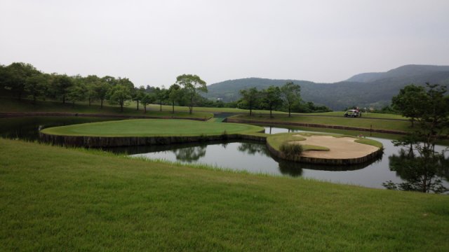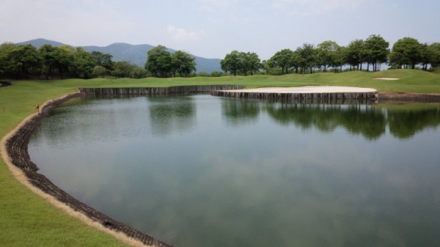 こちらのコース、池が絡むレイアウトが多いです。ショートホールには、浮島グリーンもありました。そして、変わった形のバンカー。花柄