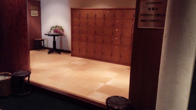 靴を脱いで入るスタイルです。靴は鍵付きのシューズロッカーがあります。荷物のロッカー内には、セキュリティボックス
