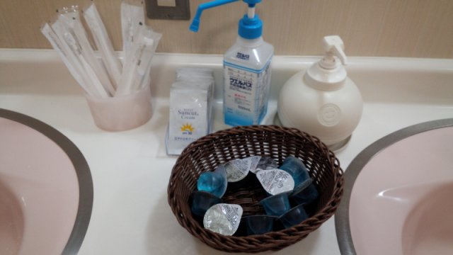 アンが気がついたのは、アメニティグッズの種類でした。歯ブラシ、マウスウォッシュ、そして日焼止めまでありました。とても助かります