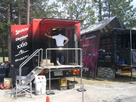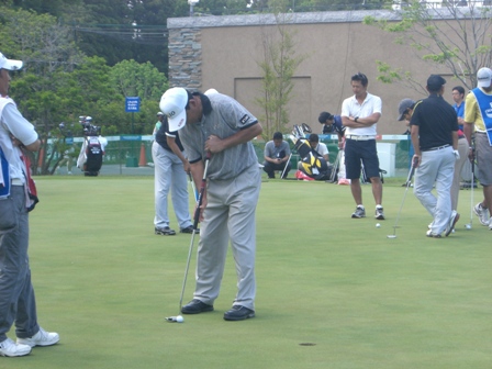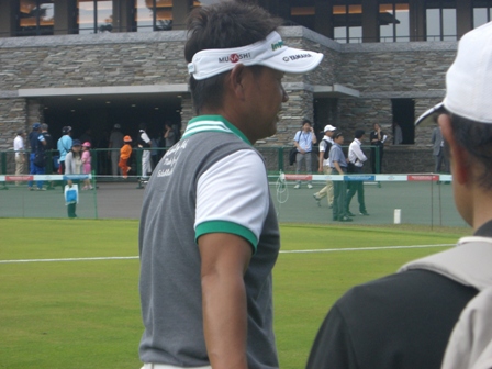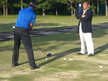 練習場ではメンバーはマットの上から打つのですが、プロは直接芝の上から打てるようになっています。