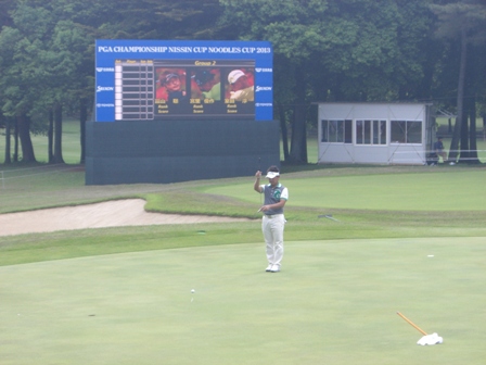 18番ギャラリースタンドに上がると、賞金王藤田選手を発見。