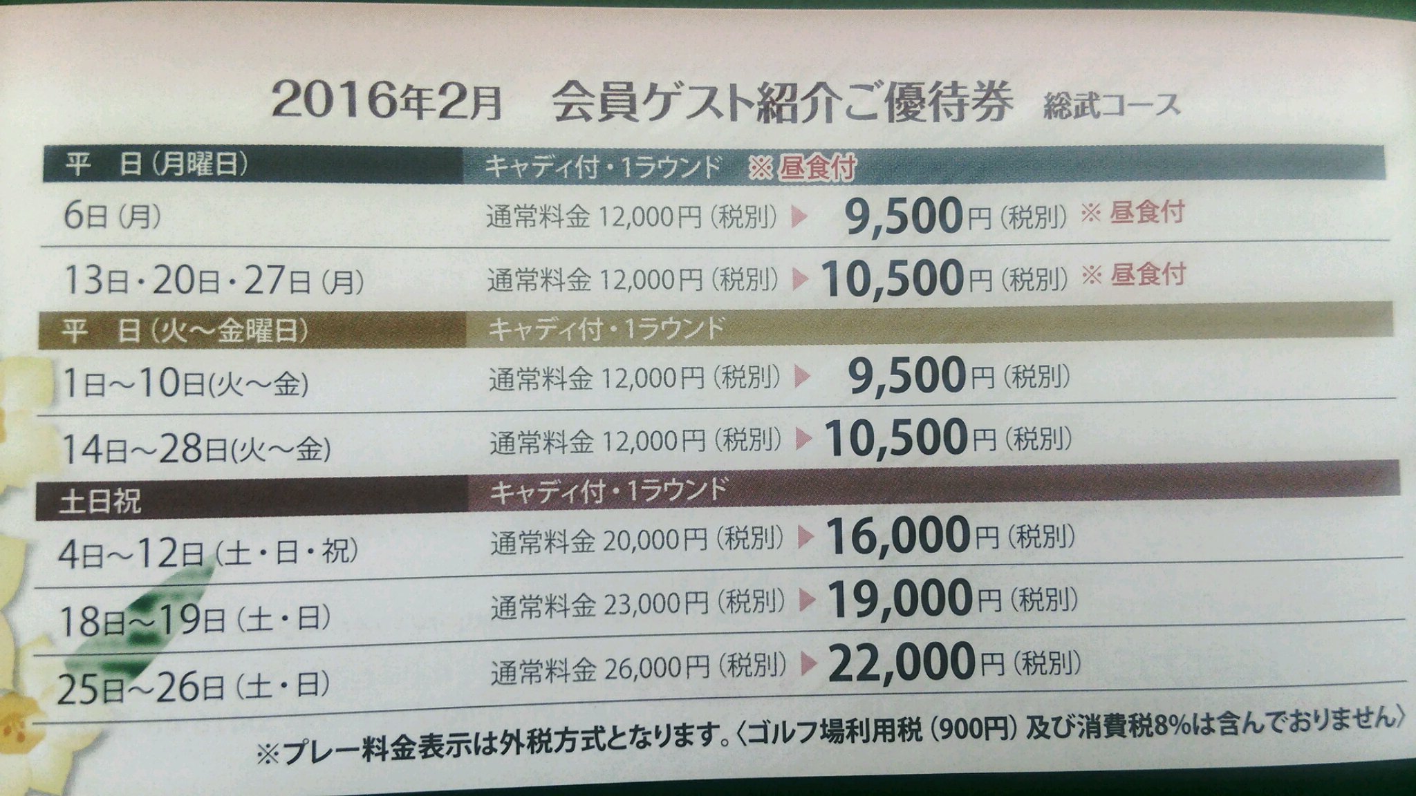 2月の閑散期は両コースともメンバー紹介の優待料金と、ビジター定価の価格差が少ない。