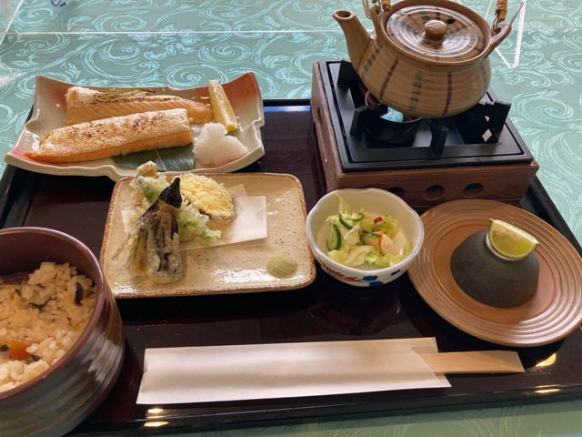 ランチは鮭ハラスにマツタケご飯と土瓶蒸しセット。