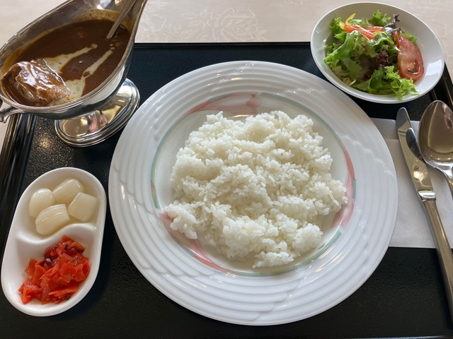 ランチのカレーはブロック肉が入った高級感のあるお味、美味しい。