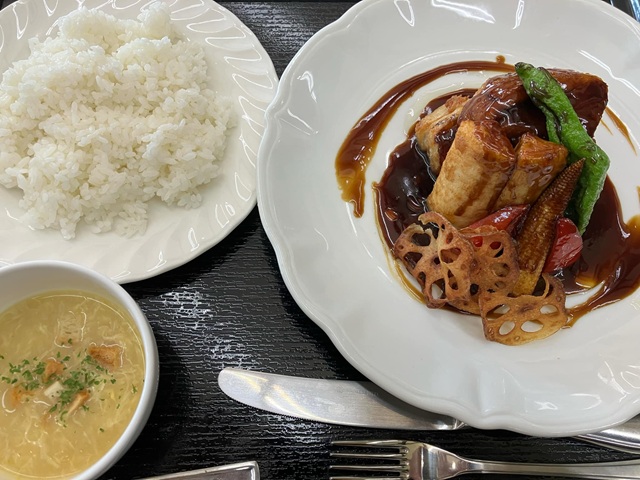 ランチは豚バラ肉の黒酢ソース、これは美味しかった。