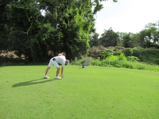 5番334yミドルは、ドライバーは右ラフへ。9アイアンで2.3mに2オン。プロは4mに2オン。先にプロが放り込む。負けじと私も放り込む。