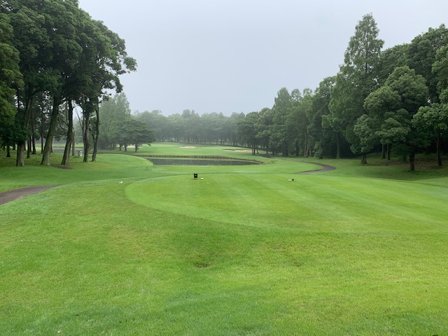 1番392y左ドッグのミドルは、ドライバーは左ラフへ。56度で木越えを敢行。残り130yから9アイアンで6mに。入らず。