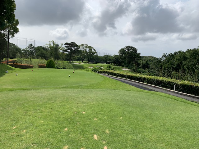 7番368y右ドッグのミドルは、ドライバーはスライスがナイス。が、残りが175y残る。25度のuで打つも右手前へ。ナイスアプでパー。谷越えを成功させて楽々2オンのS.Mさんが無難にパー。