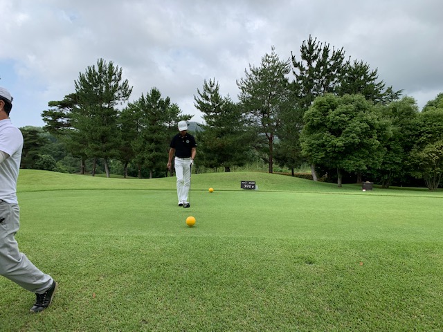 17番490yロングは、ドライバーはフェアウェイへ。残り210y打ち下ろしからの3wが竜巻球。木の脇で狙えず。4オンのボギー。ほぼ2オン付近まで飛ばしたJ.Oさんだったが、残念パー止まり。