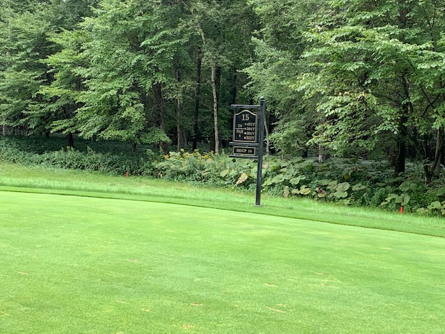 14番531yロングは、ドライバーは右へ飛ぶ。6アイアンで木の間を抜こうとしたがカーン。3w、56度で3mに4オン。入らずボギー。