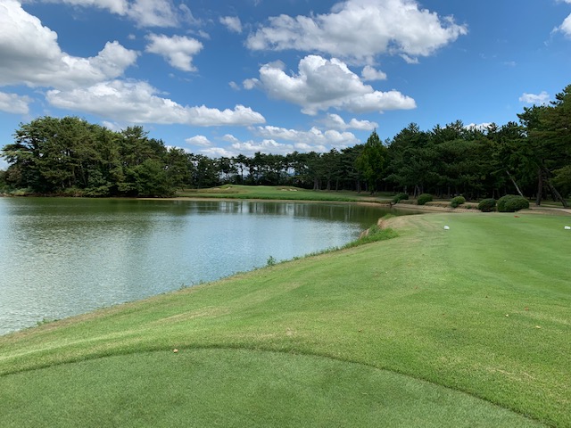 3番462yミドルは、ドライバーはまずまず。新設されたウエストエリアが効いてます。残り230yから3uで打つもど竜巻球。OBっぽい。打ち直しは右へ飛んで池の手前。2mに5オン。外して7回。エプロンからテキサスウェッジ使用で大阪府のH.Kさんが鉄パー。ナイスアミーゴ!