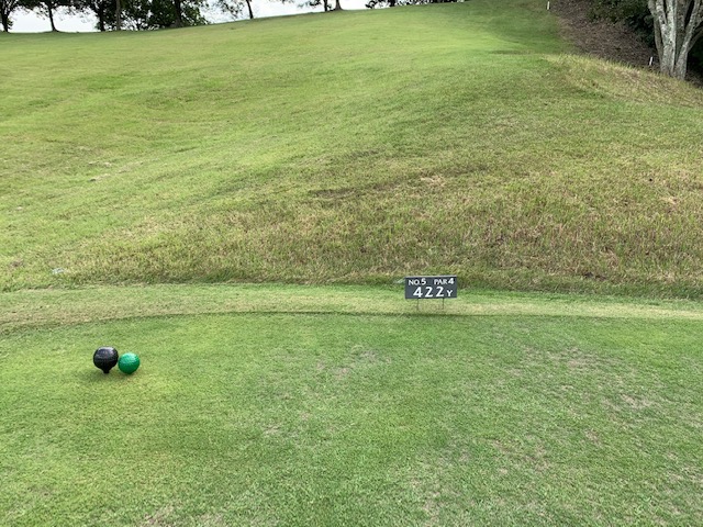 5番422yミドルは、ドライバーは竜巻球。昔もここで時々OB打ってたなー。暫定球を打つ。初球はなし。5オンの7となる。