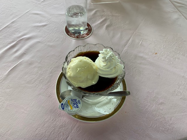 軽くお風呂に入り、レストランへ。で、コーヒーゼリーをこれまた会員のK.Tさんにご馳走になる。旨い!