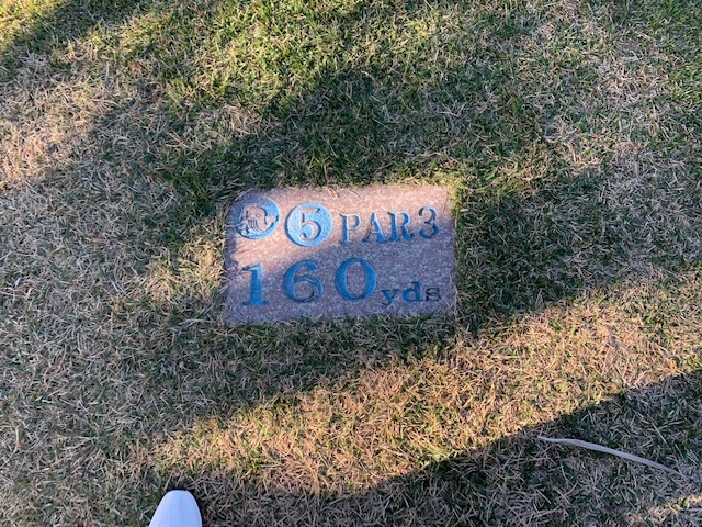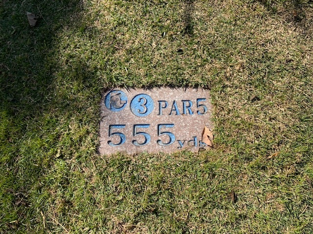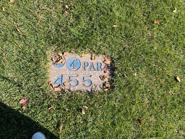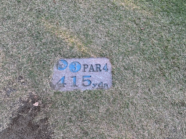 4番420yミドルは、ドライバーは左のラフへ。残り220yから3u、52度で3オン。ボギー。