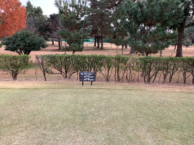 10番451yと短いロングは、ドライバーは右ラフへ。6アイアンで斜め前方へ。3打目をPWで打つも乗らず。なんとか寄せてパー。