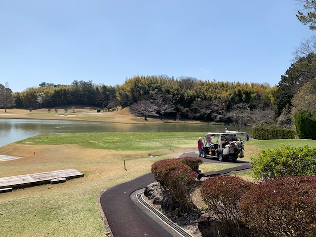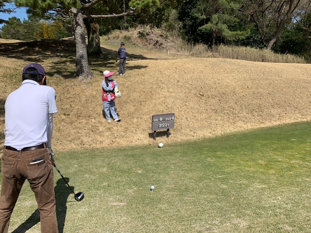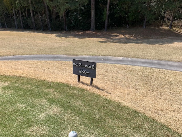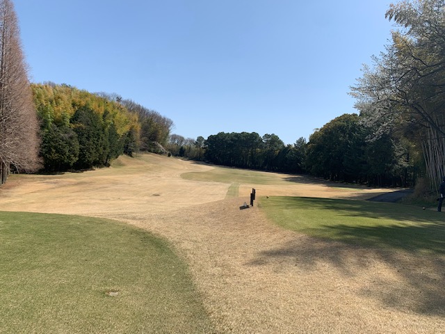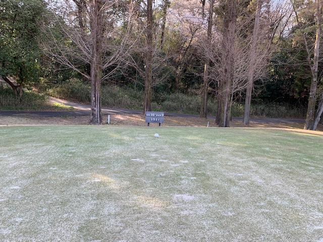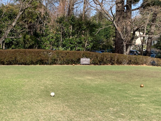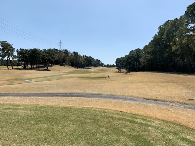 6番293yミドルは、3uで打つも右へ飛んでカートパスに当たりOB。打ち直しはまずまず。8アイアンで4オン。ダボ。見事な2オンから茨城県のK.Tさんが無難にパー。