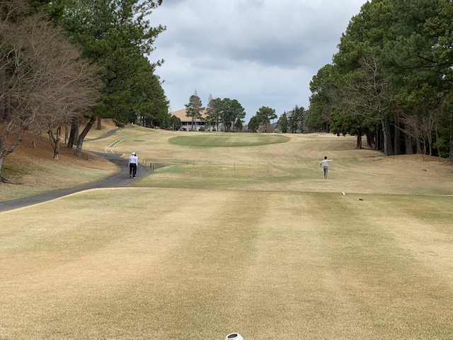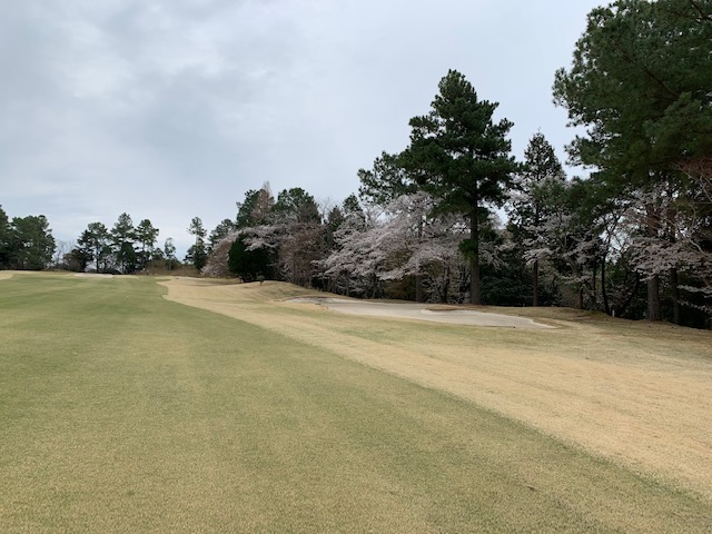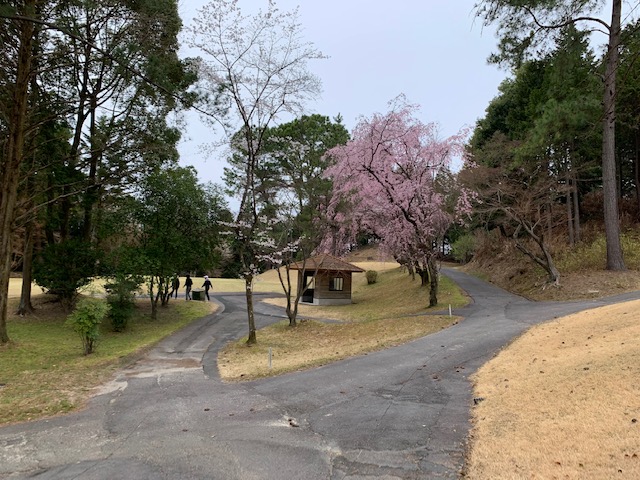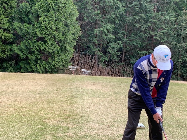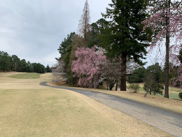 まずは、到着し、レストランで黄金水と和朝食を頂きます。鮭が小さい。今日も十二分に歓談後、少々パターを転がしてアウトから。今日も白ティ6,670yで進行します。桜が見事です。