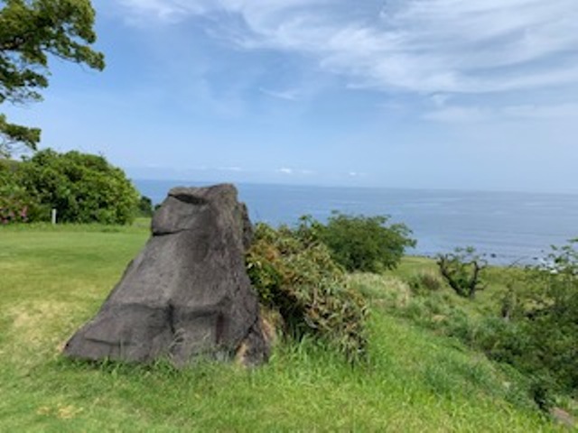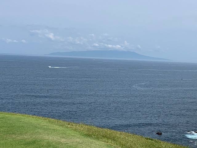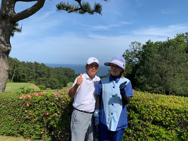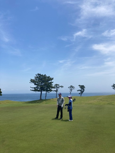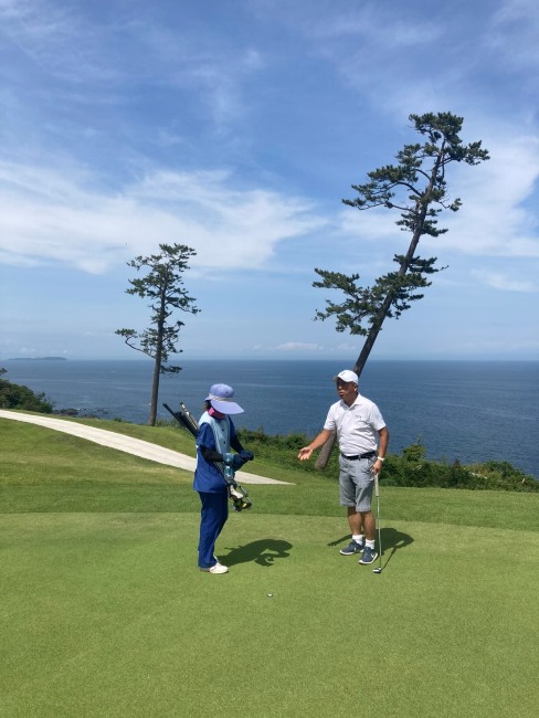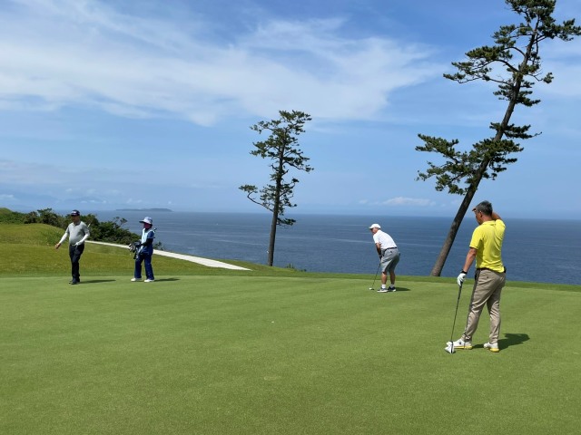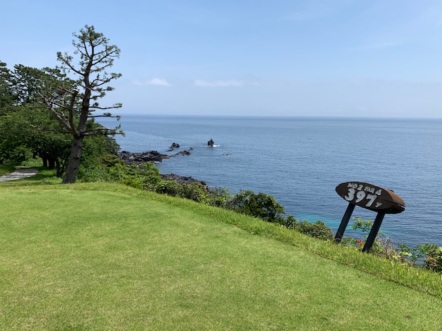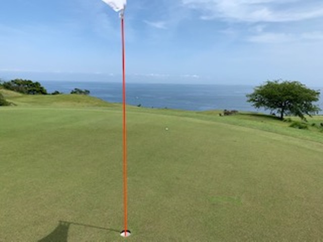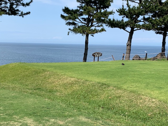 15番とっても美しいある意味日本一美しいかな?の479yロングは、ドライバーはナイス。が、左だけはダメよのこのホールでの3wが竜巻球で赤線内へ。つまり海に入ってしまう。ドロップして4打目を52度で3mにオン。が、入らない。ここも素晴らしいアプ&パターでS.Mさんがパー。5連続!