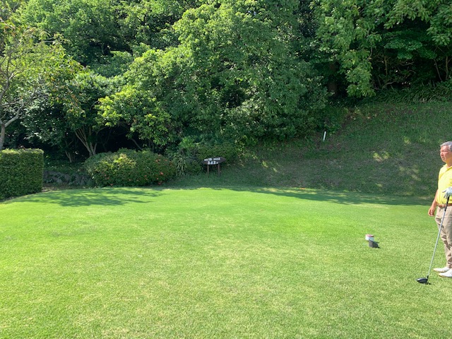 10番140yショートは、9アイアンでピン手前7mに1オン。放り込んでナイスバーディ。