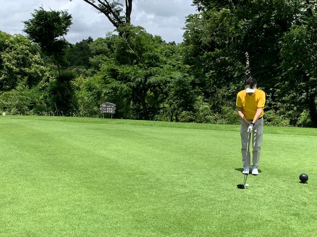 15番400yミドルは、ドライバーは右ラフへ。残り175yから25度のuで完璧球。が、グリーンを転がり過ぎて奥のラフへ。チャックリ。ボギー。