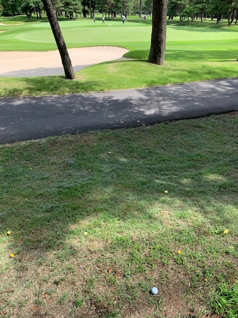 11番394yミドルは、ドライバーはちょいと左へ。2分強捜索したがないので、急いで戻る。で、打とうとしたらあったそうな。が、タイムオーバーであるため、3打目を打つ。8アイアンで4オン。ダボ。素晴らしいアプ&パターでR.Sさんがパーゲット。