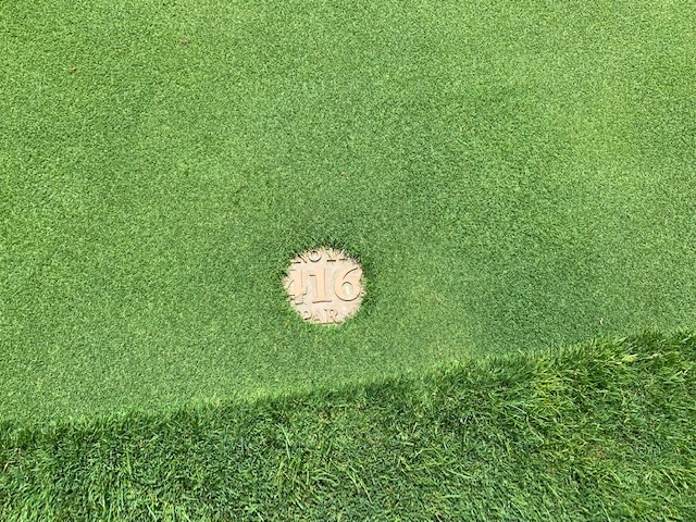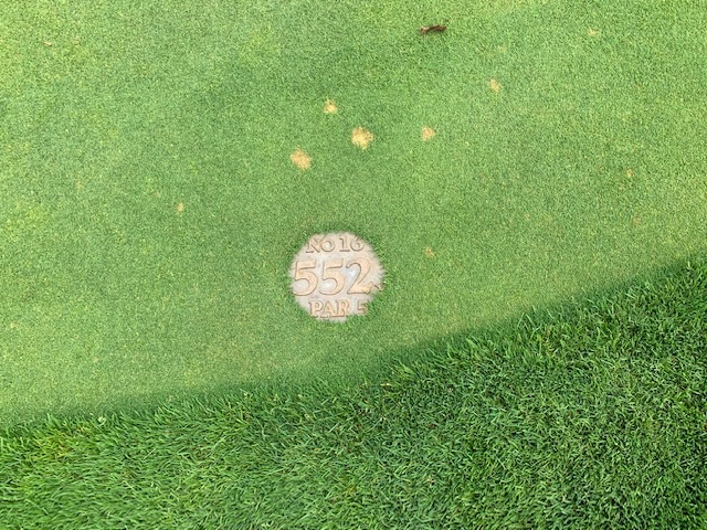16番552yロングは、ドライバーは右へ。3wで根性で池先の左の林入口へ。6アイアンで花道へ。56度で3mに4オン。残念ながら入らず。N.Tさんが3オンから無難にパー。ついにイーブンに。追いつかれた。。。